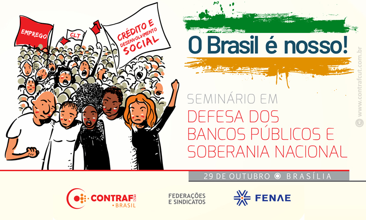 Bancários e bancárias de todo o país vão até Brasília, nesta terça-feira (29), para debater a importância dos bancos públicos para a sociedade brasileira. O seminário “O Brasil é nosso” será promovido pelas frentes parlamentares mistas em Defesa da Soberania Nacional e em Defesa dos Bancos Públicos como parte da campanha em defesa dos bancos públicos, da soberania nacional, do crédito, do emprego e do desenvolvimento e conta com o apoio da Confederação Nacional dos Trabalhadores do Ramo Financeiro (Contraf-CUT) e da Federação Nacional das Associações dos Empregados da Caixa (Fenae).