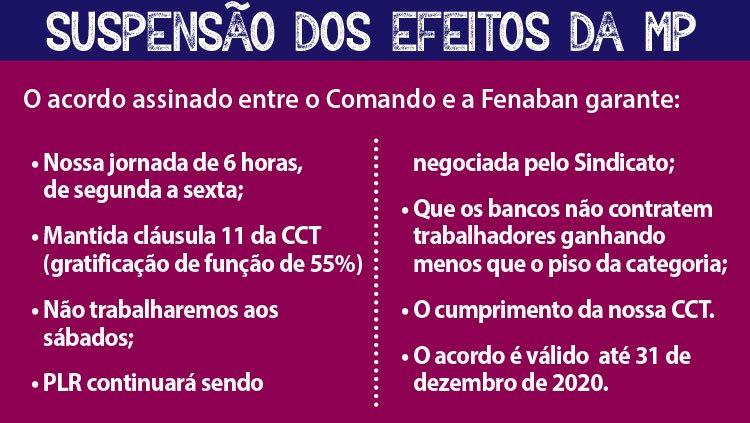 Pontos que seriam alterados pela Medida Provisória (MP) 905/2019, como a jornada de seis horas, a não abertura das agências bancárias aos sábados e a negociação da Participação nos Lucros e/ou Resultados pelos sindicatos foram mantidas conforme prevê a CCT da categoria.