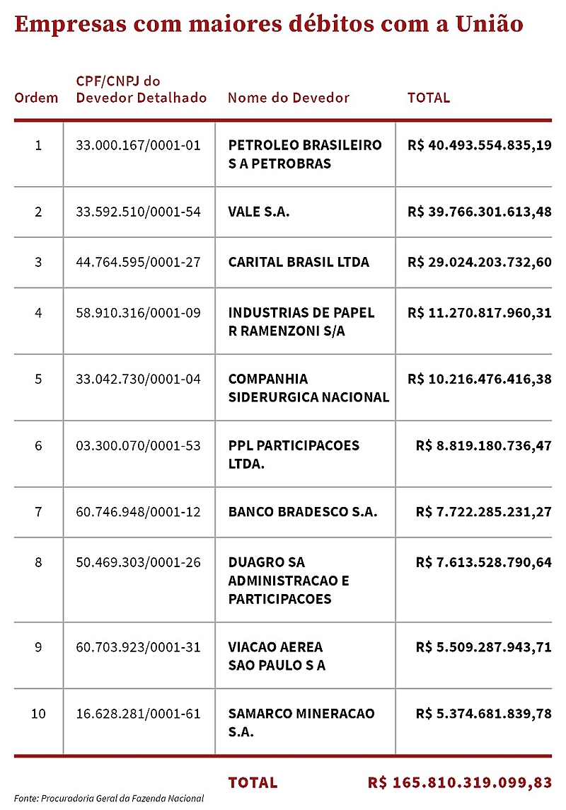 A Petrobras puxa a fila das empresas que mais devem, com uma dívida de R$ 40,4 bilhões, sendo os maiores débitos, R$ 14,8 bilhões e R$ 13 bilhões, referentes ao Imposto de Renda Retido na Fonte (IRRF) e o Imposto de Renda Pessoa Jurídica (IRPJ), respectivamente.