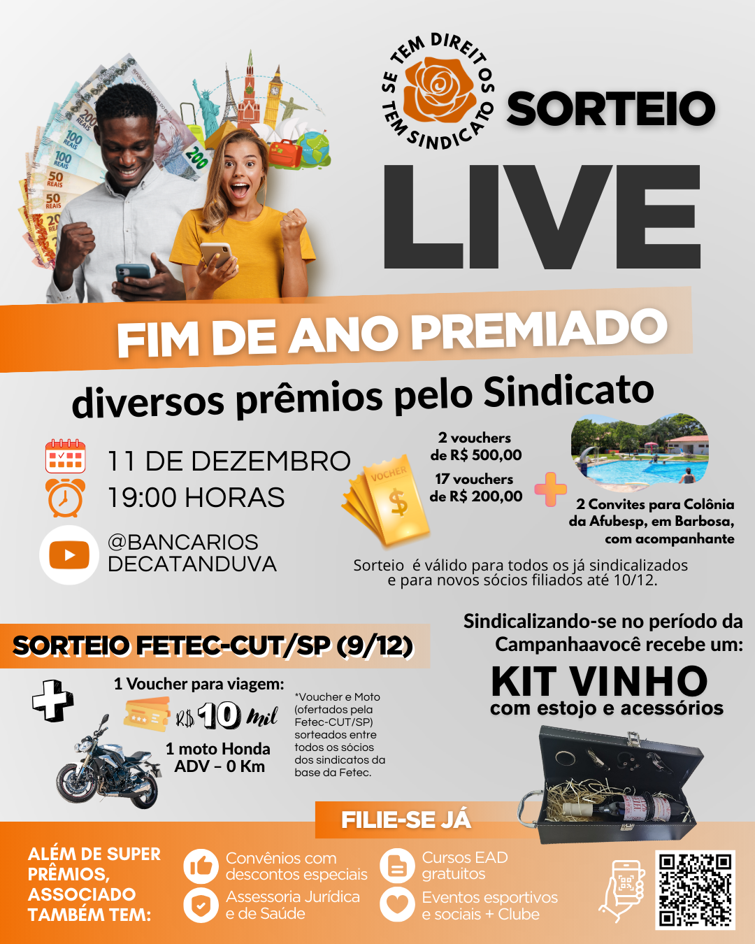 Mas, antes desta data, tem mais emoção garantida: no dia 9 de dezembro, ocorre um sorteio especial realizado em parceria com a Fetec-CUT/SP, com uma moto Honda ADV 0 km e um voucher de viagem no valor de R$ 10 mil. Nesta etapa, participam todos os trabalhadores e trabalhadoras associados aos 15 sindicatos filiados à Federação, incluindo Catanduva e região.