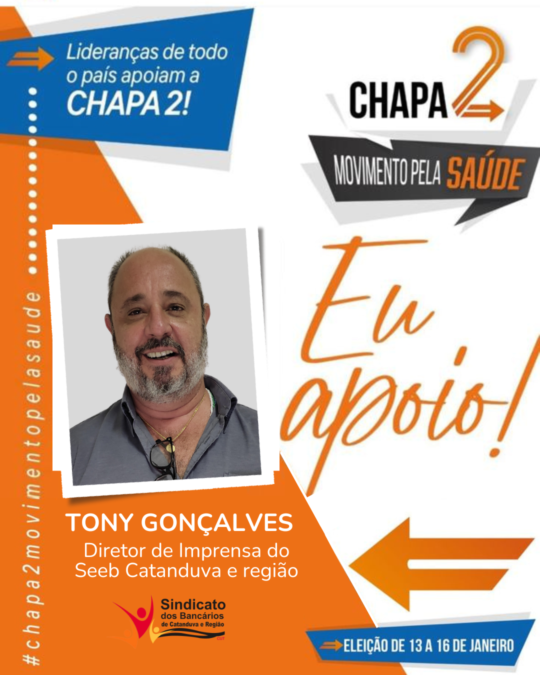 O diretor do Sindicato dos Bancários de Catanduva e região, Antônio Júlio Gonçalves Neto (Tony), ressalta que é fundamental escolher pessoas que tenham comprometimento com os direitos dos participantes para uma boa gestão do Saúde Caixa. "A Chapa 2 integra candidatos que representam as diversas forças do movimento associativo e sindical comprometidas com a defesa dos direitos dos usuários e a sustentabilidade do Saúde Caixa."