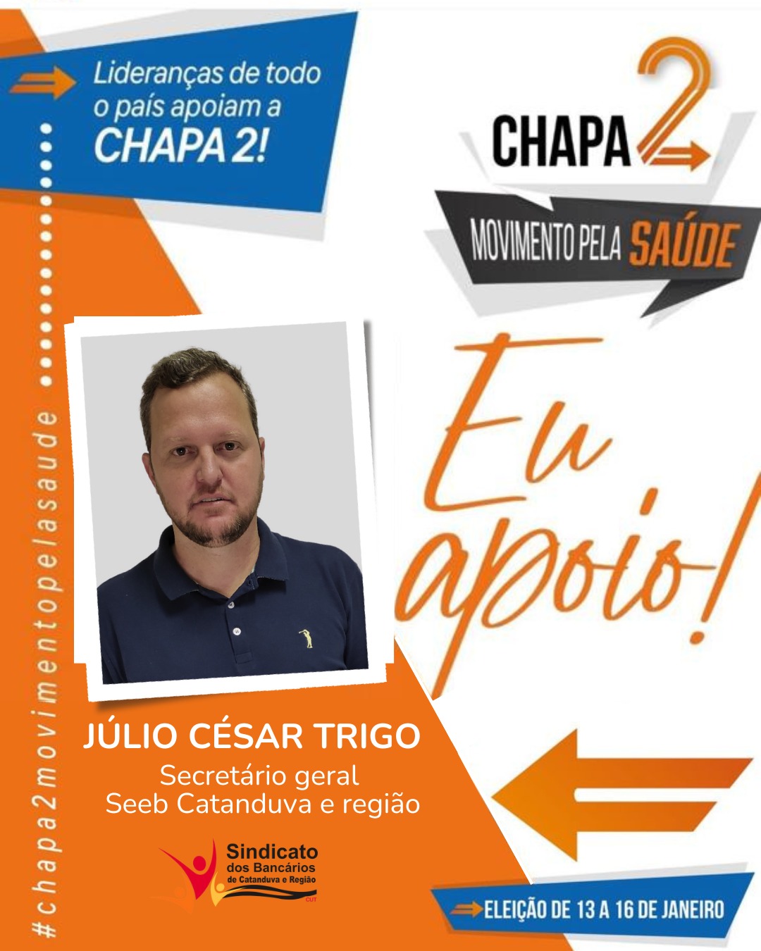 O Sindicato dos Bancários de Catanduva e região, a Fenae, Contraf-CUT, Apcefs e a Fetec-CUT/SP reforçam a importância do engajamento dos empregados nesse processo e apoiam a Chapa 2, “Movimento pela Saúde”, que reúne candidatos com histórico de atuação na defesa do Saúde Caixa e propostas voltadas ao fortalecimento do plano.