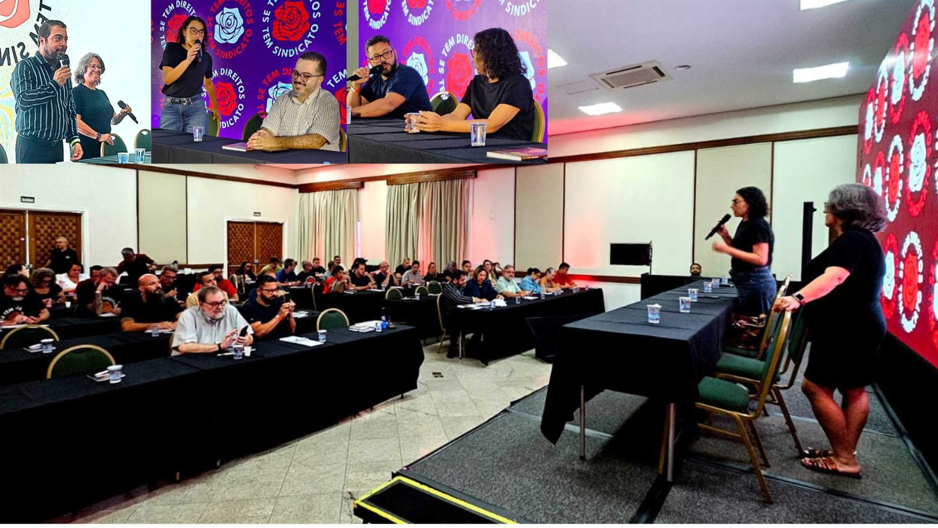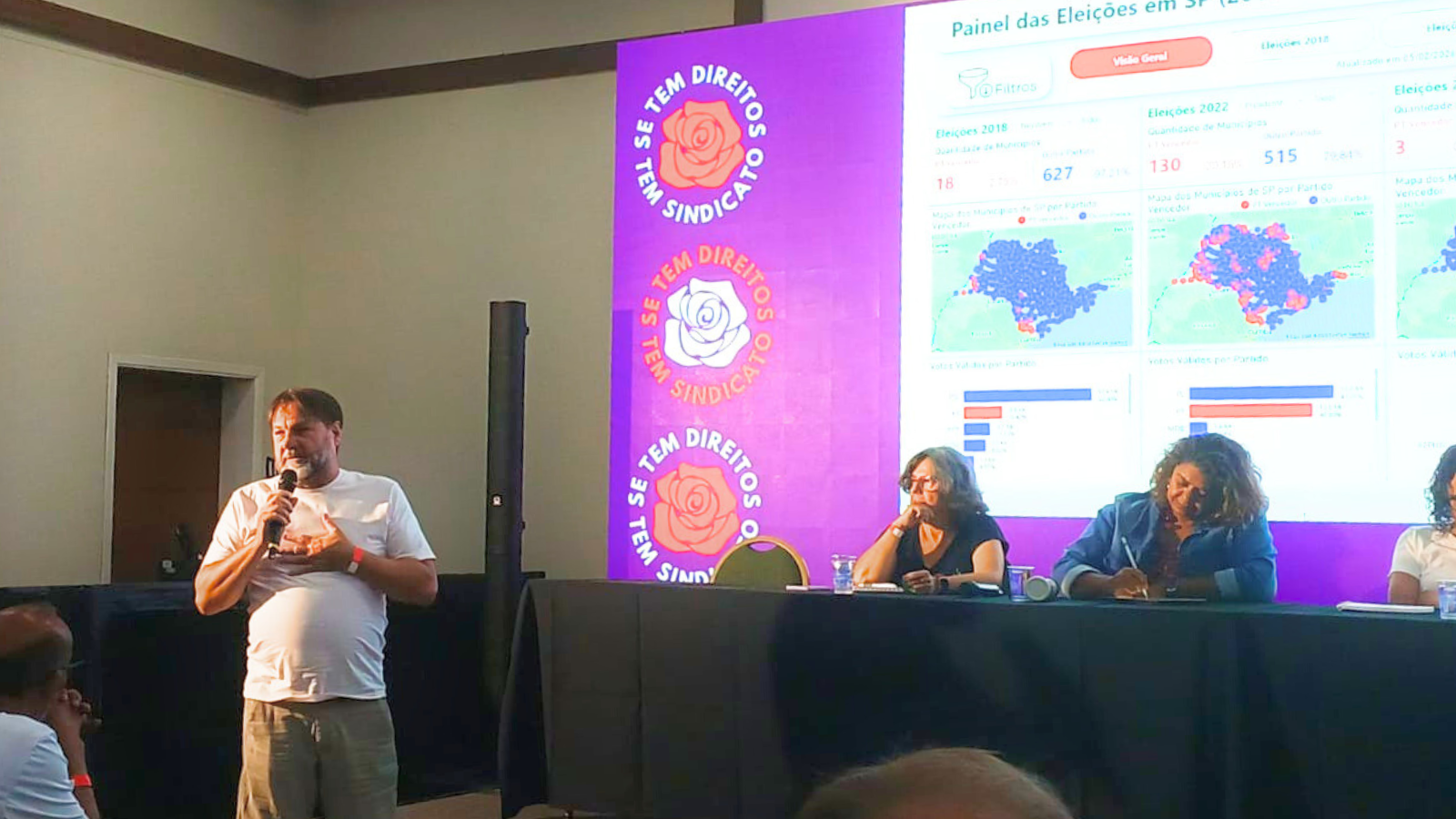 Ao final do primeiro dia do Seminário, o jornalista e escritor Pedro Zambarda, fundador do Diário do Centro do Mundo, participou de uma mesa conduzida por Aline Molina e Willame Lavor, secretário de Comunicação da FETEC, com análise da conjuntura nacional e internacional, com foco no cenário da guerra no Oriente Médio.