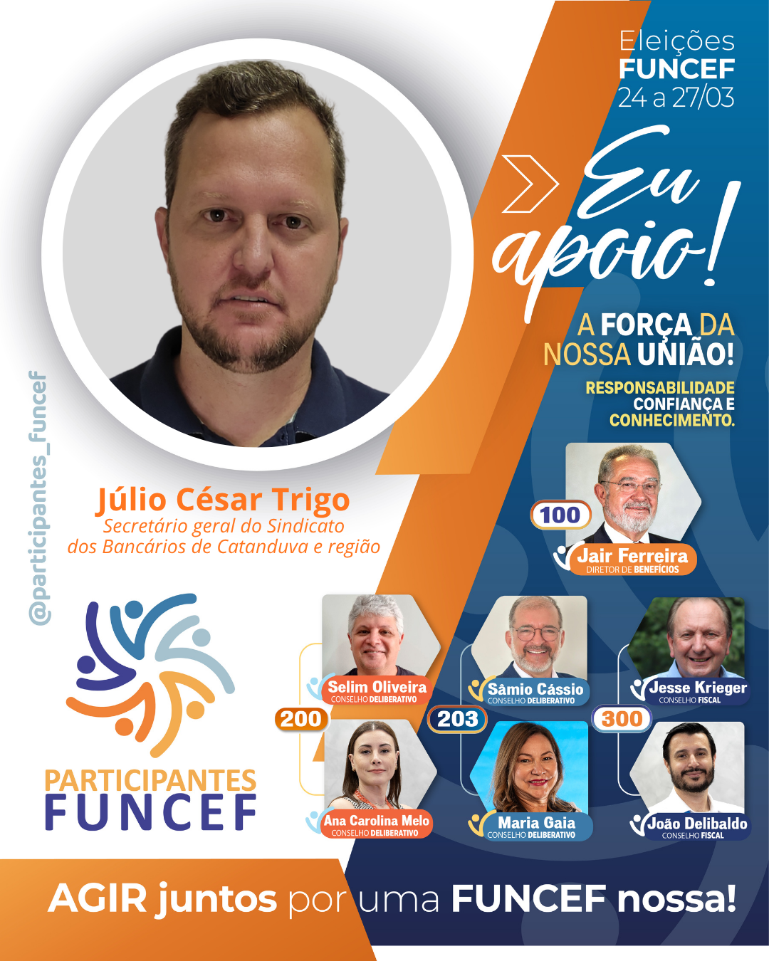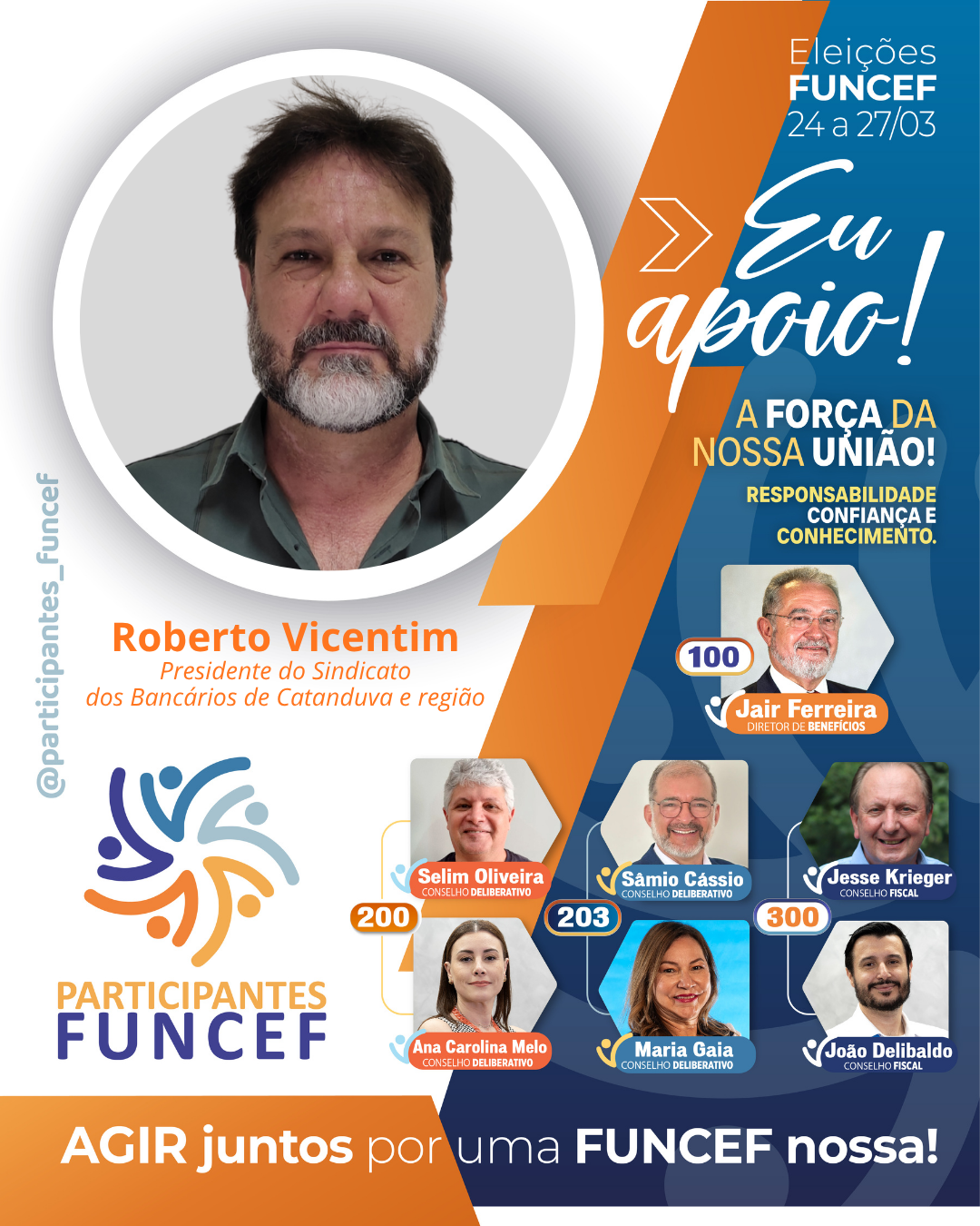 O grupo é formado pelo atual diretor de Benefícios, Jair Pedro Ferreira, e um dos membros do Conselho Deliberativo, Selim Antônio de Salles Oliveira, como candidatos à reeleição. Sâmio Cássio, atual presidente do Conselho Fiscal, concorre à segunda vaga do Conselho Deliberativo. Neste período mais recente, com Jair, Selim e Sâmio na diretoria e nos conselhos a Funcef teve: