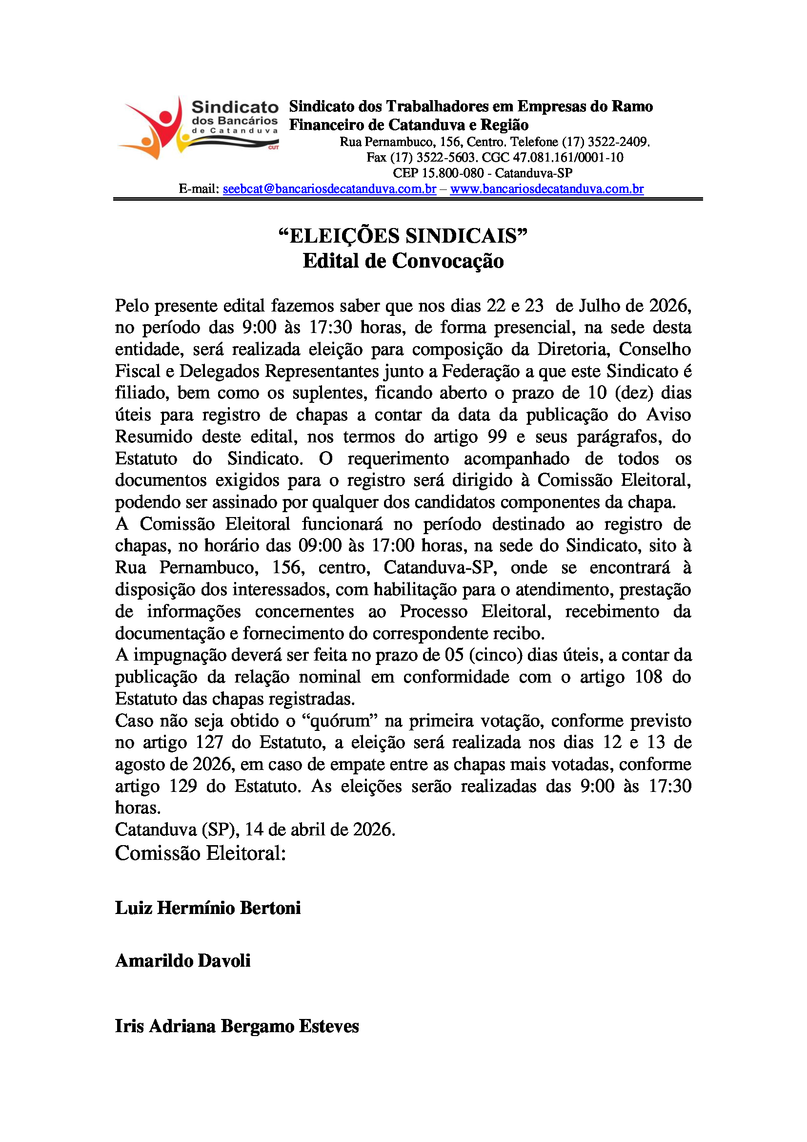 - Aviso resumido sobre eleições para a diretoria do Sindicato dos Bancários de Catanduva e região