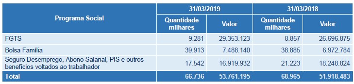 Banco Social - As Loterias Caixa arrecadaram R$ 3,3 bilhões no 1T19, mantendo o patamar alcançado no 1T18. Dentre os valores arrecadados, cerca de R$ 1,2 bilhão foram transferidos, no período, aos programas sociais do governo federal nas áreas de seguridade social, esporte, cultura, segurança pública, educação e saúde, o que corresponde a 37,2% do total. A tabela a seguir resume a participação da Caixa em políticas públicas e em programas dirigidos aos trabalhadores do País.
