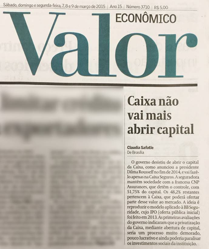 A edição desta segunda-feira (9) do jornal Valor Econômico informa que o governo desistiu de abrir o capital da Caixa Econômica Federal. De acordo com a nota, a medida será feita apenas na Caixa Seguros, seguradora que mantém sociedade com a francesa CNP Assurances e da qual o banco detém 48,2%. Na avaliação do Planalto, diz o texto, a abertura de capital “seria um processo muito demorado, pouco lucrativo e ainda poderia paralisar os investimentos sociais da instituição”.