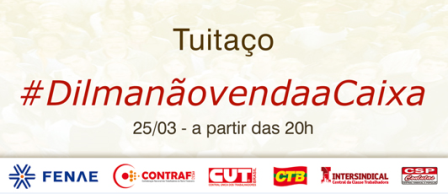 O Comitê Nacional em Defesa da Caixa 100% Pública divulgou nesta quinta-feira (12) que o "tuitaço" contra a proposta de abertura de capital do banco será realizado no dia 25 de março. Nesta data, a partir das 20h, empregados da instituição, dirigentes de entidades do movimento sindical e associativo e todos os brasileiros que apoiam a causa devem postar no Twitter mensagens utilizando a hashtag #DilmanãovendaaCaixa.