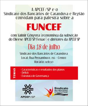 O Sindicato dos Bancários de Catanduva e Região e a Apcef-SP – Associação de Pessoal da Caixa Econômica Federal, em conjunto com a Fenae e o Dieese, promovem uma palestra sobre a Funcef – Fundação dos Economiários Federais, no dia 18 de julho. Serão abordadas características dos planos, déficit e estrutura de governança.