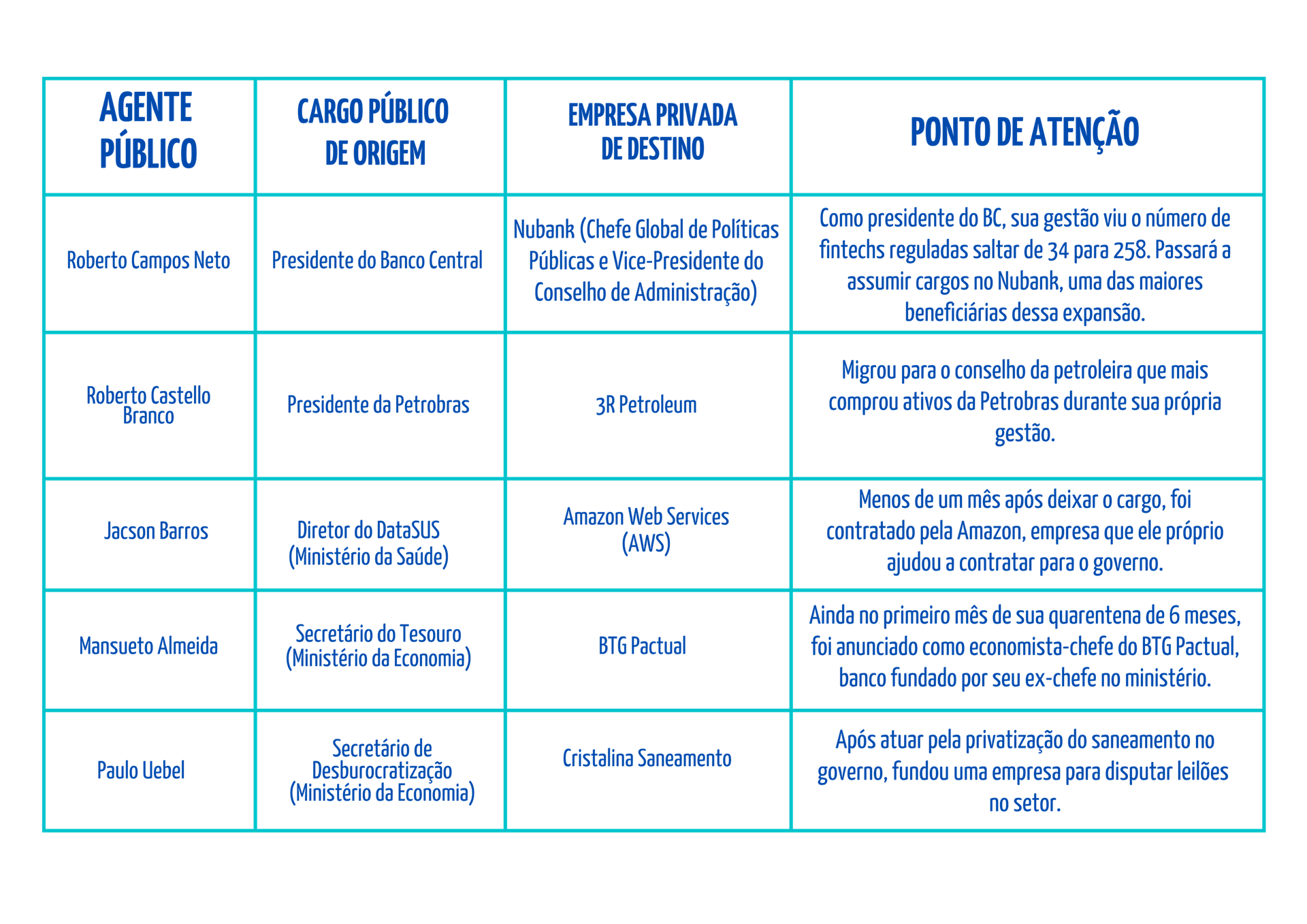 Os exemplos a seguir ilustram como o movimento de figuras públicas entre o governo e o mercado levanta essas suspeitas – e que tal movimentação não fica presa apenas ao setor financeiro.