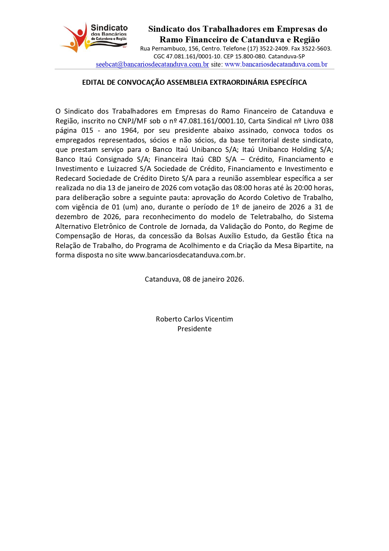 EDITAL ASSEMBLEIA EXTRAORDINÁRIA ESPECÍFICA DO ITAÚ - Acordo Coletivo de Trabalho