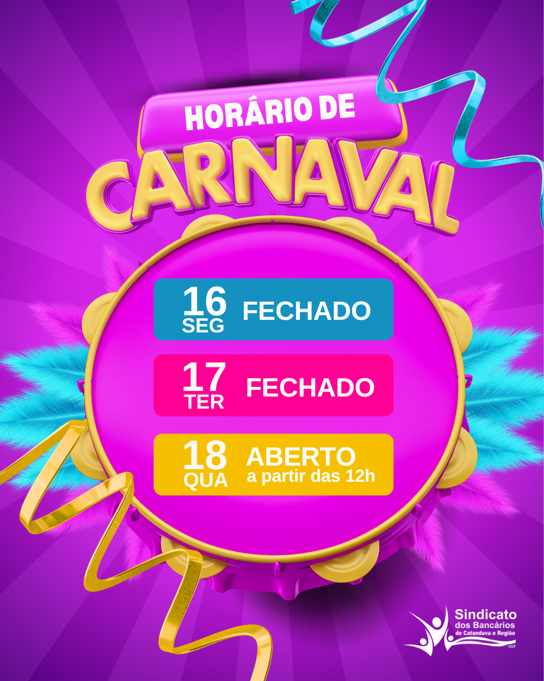 O Sindicato dos Bancários de Catanduva e região informa a seus associados que seguirá o cronograma divulgado pelos bancos para o Carnaval. Confira: