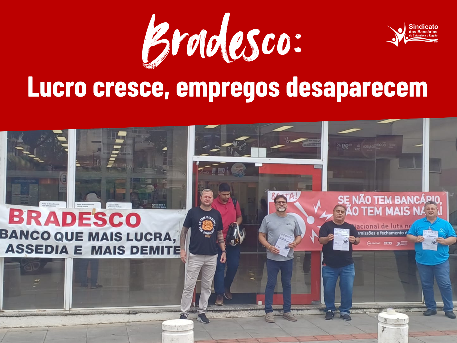 O contraste não poderia ser mais evidente. E foi exatamente isso que o Sindicato dos Bancários de Catanduva e região escancarou nesta terça-feira (17), durante o Dia Nacional de Luta dos Funcionários do Bradesco. Em visita às agências, a entidade levou denúncia e mobilização contra a política de gestão do banco, com a distribuição de um Infopress, fixação de faixas na fachada da agência e palavras de ordem.