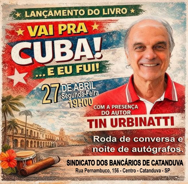 O auditório do Sindicato será palco, no próximo dia 27 de abril, às 19h, de uma atividade cultural que promete provocar reflexões importantes sobre política, cultura e integração latino-americana. Trata-se do lançamento do livro “Vai pra Cuba!... E eu fui!”, de Tin Urbinatti, que estará presente para uma roda de conversa com o público e sessão de autógrafos.